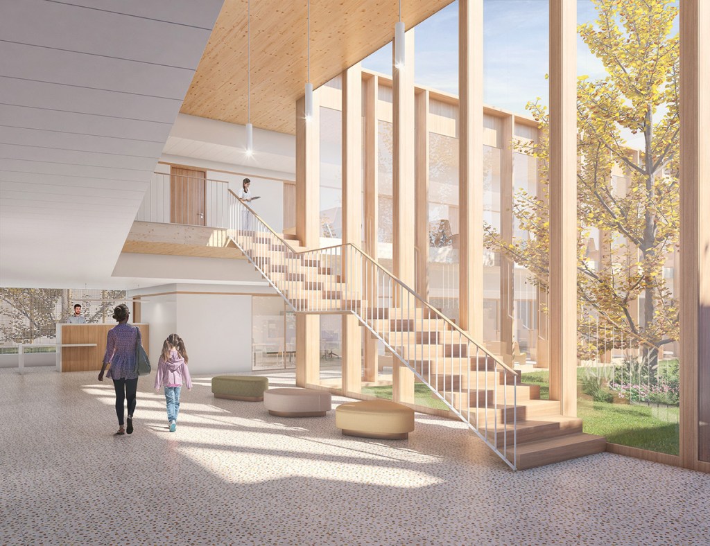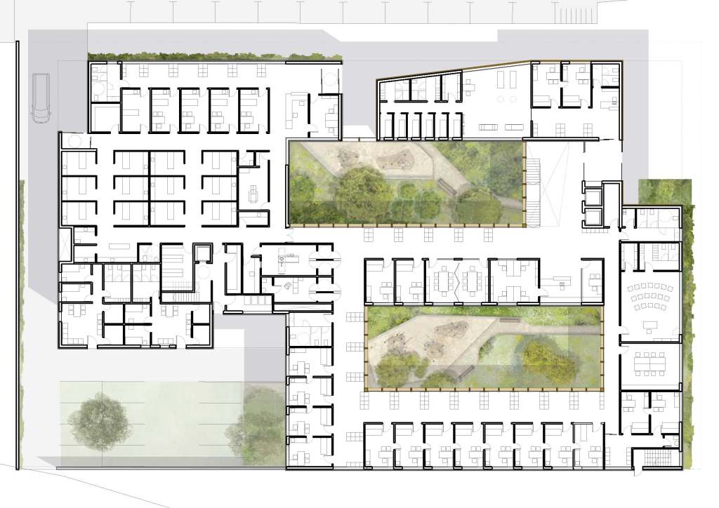 The primary healthcare centre is organised on two floors around two large courtyards filled with vegetation and elements for play and exercise. The courtyards allow natural light and air to reach all areas accessible to outpatients while providing views of their vegetation and activities as well as to the outside from all spaces. The staff, service and emergency areas are designed to be compact while still having access to cross and natural ventilation when necessary. A spacious double-height entrance hall connects both courtyards with the outdoors. It facilitates access to the functional layout and interior circuits, allowing easy access to different areas spread across the ground and first floors.