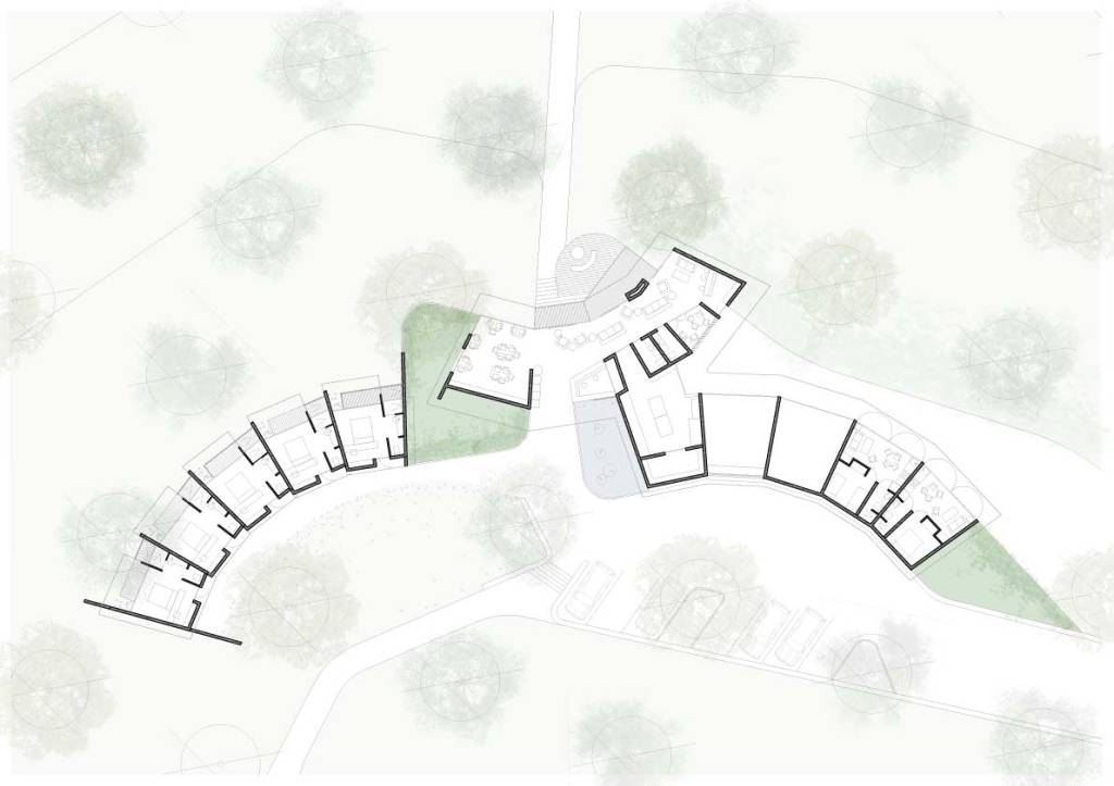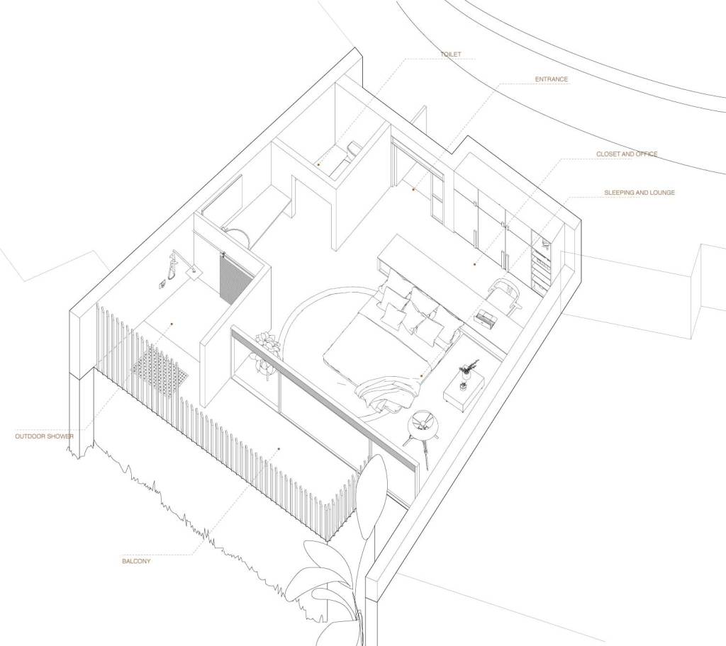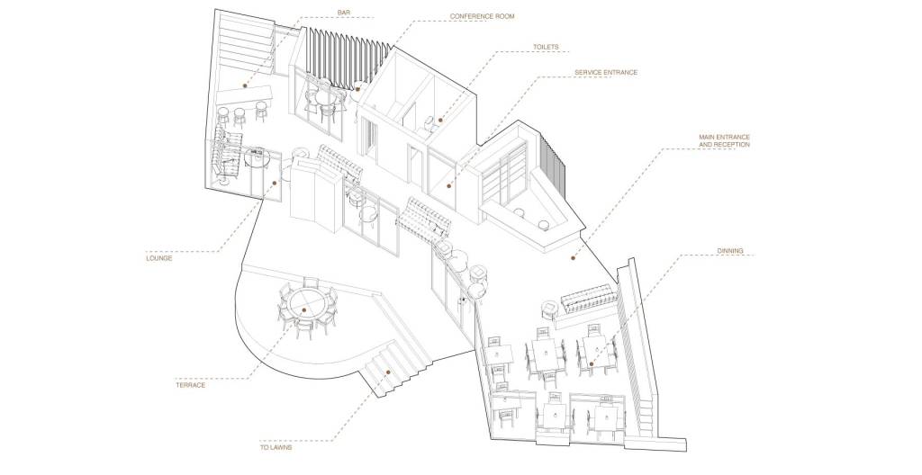 The lodge was designed to offer stunning views of Lake Kivu and the DRC mountains while maintaining guest privacy and providing incredible sunrises and sunsets. The construction consists of three hand fans or arches: one for the service areas on the east side, which includes apartments for service, laundry, storage, and kitchen, with direct access to the common area containing a bar, a chill-out area, toilets, a chimney, a sofa area, a terrace, a bonfire, and the entrance to the dining area. On the west side, to the left of the reception area, are the rooms, each with a small entrance, toilet, desk, king-sized bed, balcony, and outdoor shower.