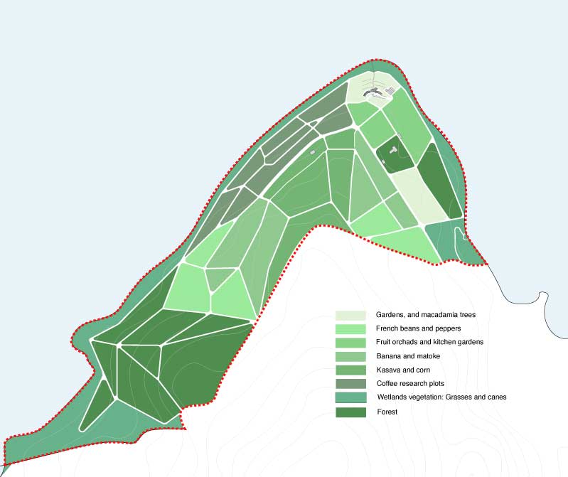 The large piece of land where the guest house is located is a working farm and a test for growing coffee and other crops such as macadamia nuts, avocados, bananas, pineapples, and green beans. The farm also has a kitchen garden for the guest house and a network of paths for hiking and enjoying the diverse indigenous plants, grasses, and trees.