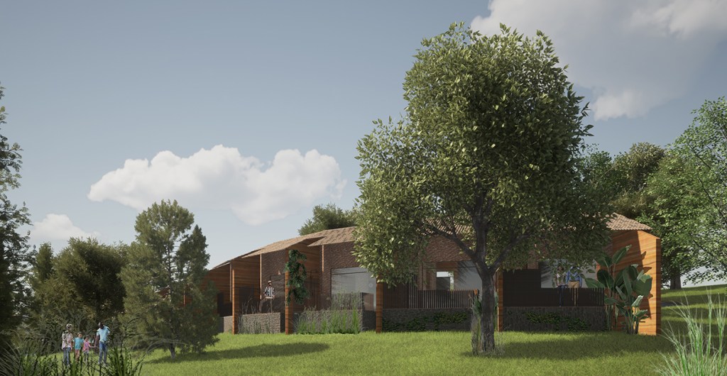 The guest house aims to have a small ecological footprint, which affects the choice of construction materials such as artisanal ceramic roof tiles, rammed earth walls, CEB walls, terracotta tiles, local stone for floors, and local wood for furniture and openings. Water management, energy production, and waste management systems are also designed with this in mind