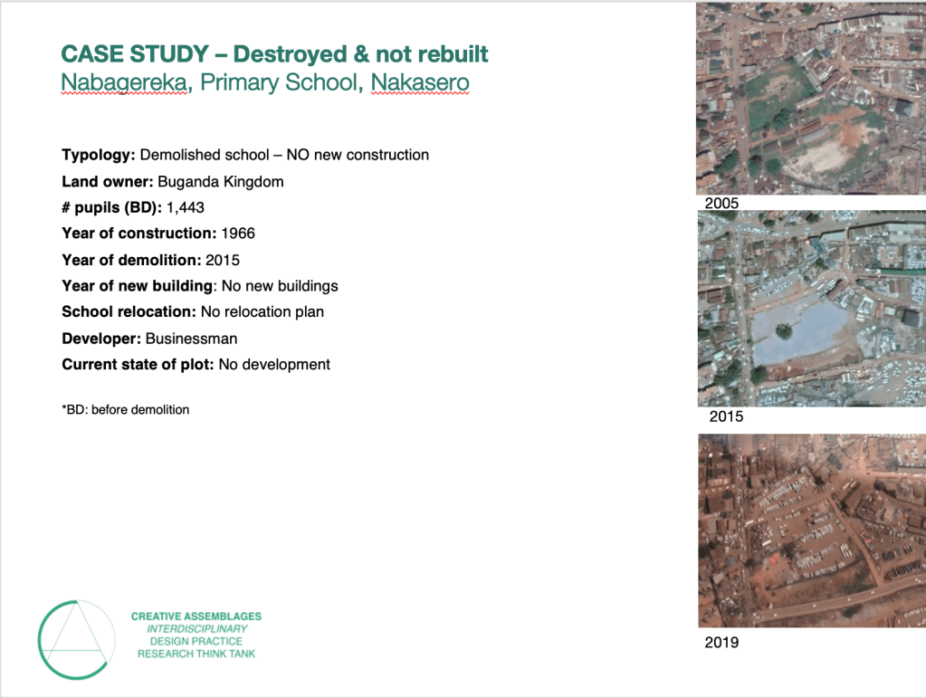 Public primary school facilities in non-public land in urban Kampala are being demolished to make way for money-making real estate developments. This poses a slow but relentless threat to public education in the city and is a result of several challenges. These challenges include inefficient use of land in primary school facilities, inadequate government funding for the repair and maintenance of public urban schools, lack of projects or policies that attract funds for urban schools and child-friendly cities, increasing land value in the central area of Kampala, growing investor interest in construction development for commercial projects in city centers (such as malls, housing, offices, and hotels), the need for urban densification to increase the efficiency of services and accommodate the growing urban population, widespread corruption in land management and construction projects by local and government officials and investors, and a lack of participation of civil society and various stakeholders in urban policies and project development.
