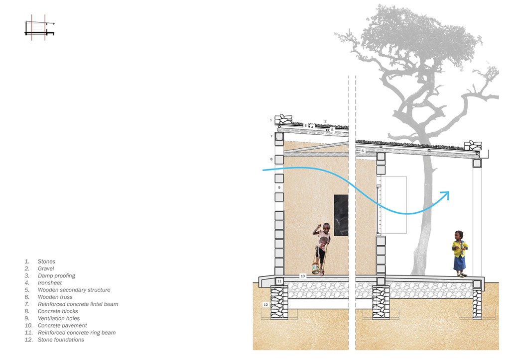 The design itself utilized local stones for the walls and foundations, which were plastered towards the interior of the classroom, and incorporated a false ceiling to mitigate heat and noise from the metal roof. The design also included important shaded areas, such as a longitudinal covered access pathway to the classrooms and a roofed outdoor classroom that can work as an overflow classroom, a meeting area for the community during out-of-school time, and a shaded playground.