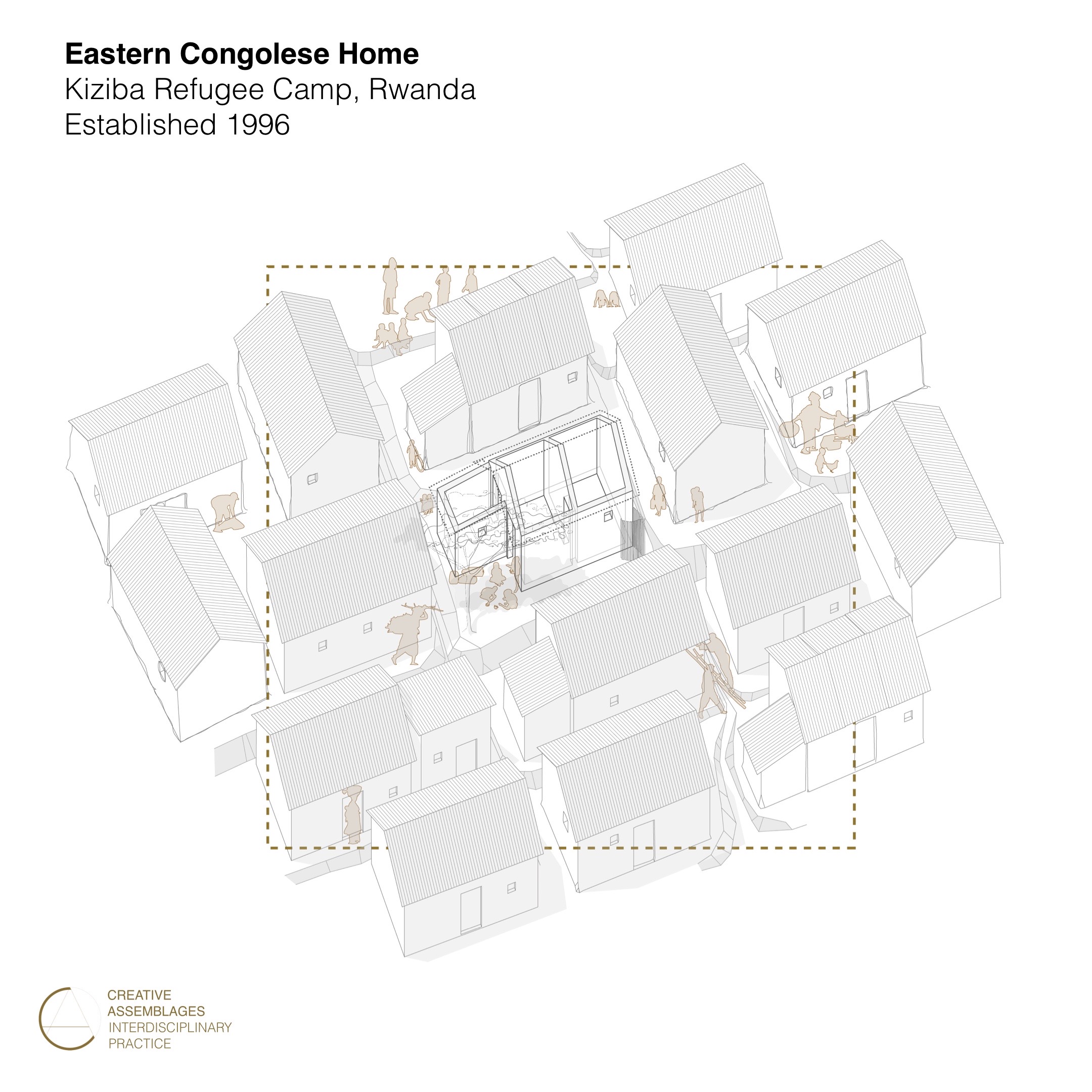 Al establecer campos de refugiados en Uganda, Ruanda y Kenia, el ACNUR y los diferentes gobiernos anfitriones proporcionan infraestructuras temporales de alojamiento – desde postes y lonas hasta tiendas de campaña – montadas por equipos de técnicos o por los refugiads con ayuda de estos equipos. Semanas o meses después, los refugiados comienzan a apropiarse de estas estructuras, transformándolas con muros de barro, techos de lona o chapa metálica, sobre la huella inicial de sus “refugios”.